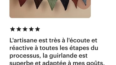 Dès réception de votre demande de personnalisation, nous examinerons attentivement vos préférences. Notre objectif est de dénicher le tissu idéal qui donnera vie à votre guirlande unique. Nous mettrons notre passion pour la couture et la recherche de tissus à votre service, en veillant à ce que le produit final soit exactement ce que vous avez imaginé.