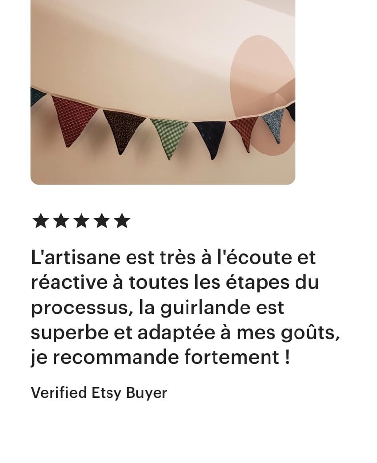 Chez La Guirlande Française, nous pensons que vos décorations doivent être aussi uniques que vos célébrations. C'est pourquoi nous vous proposons une option de personnalisation spéciale pour que votre guirlande de fanions en tissu corresponde parfaitement à votre vision.